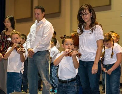 The Suzuki parent attends all lessons and practices with the students each day as the “home teacher.”
